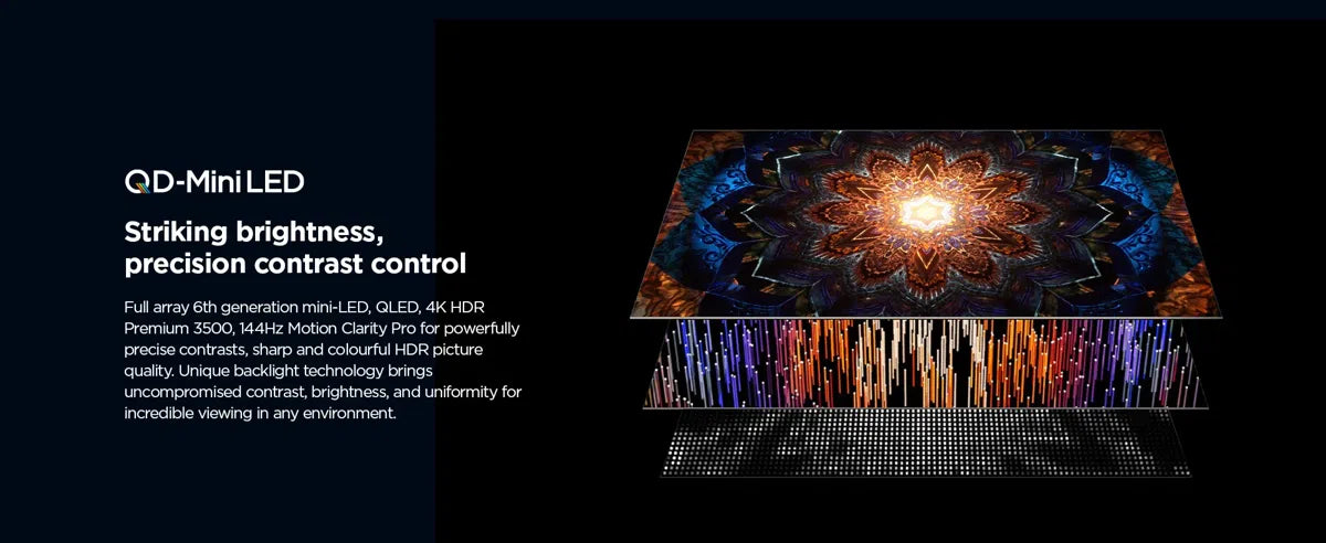QD-Mini LED with up to 3500-nit peak brightness and precise local dimming.