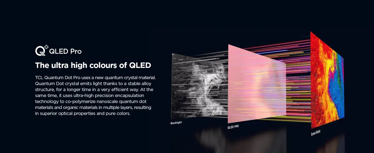 Colour is handled by TCL’s QLED PRO layer and AiPQ Pro processing, unlocking a wide colour gamut with clean gradations and refined upscaling of HD sources.