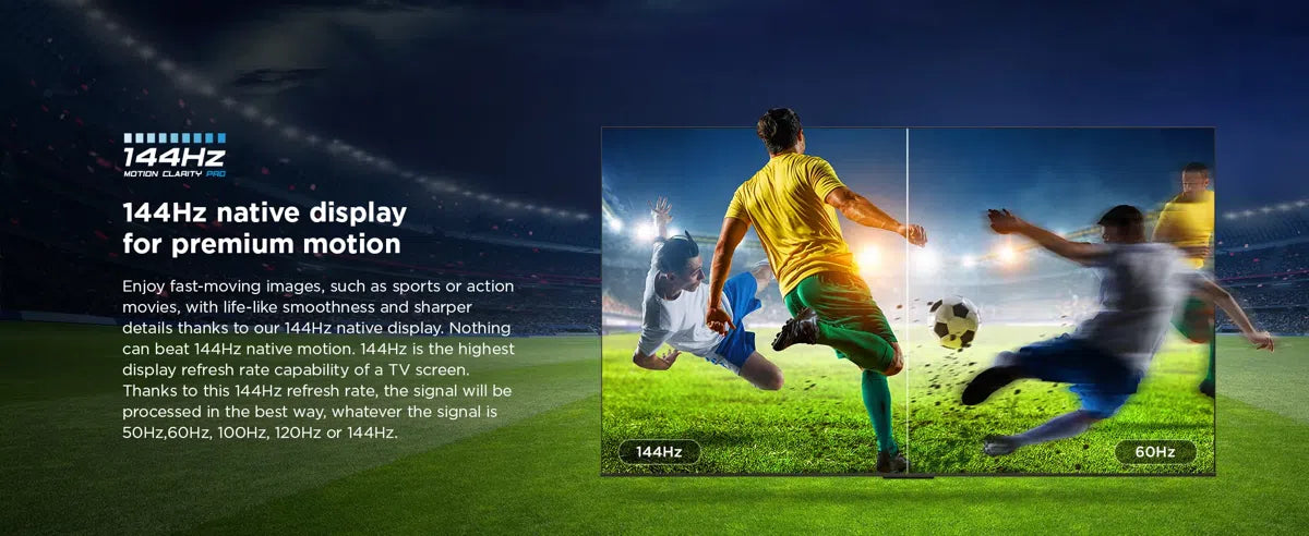 Gamers get a native high-refresh experience: 144Hz Motion Clarity PRO, HDMI 2.1 with 4K/144, Variable Refresh Rate and Auto Low-Latency Mode keep motion smooth and input lag low.