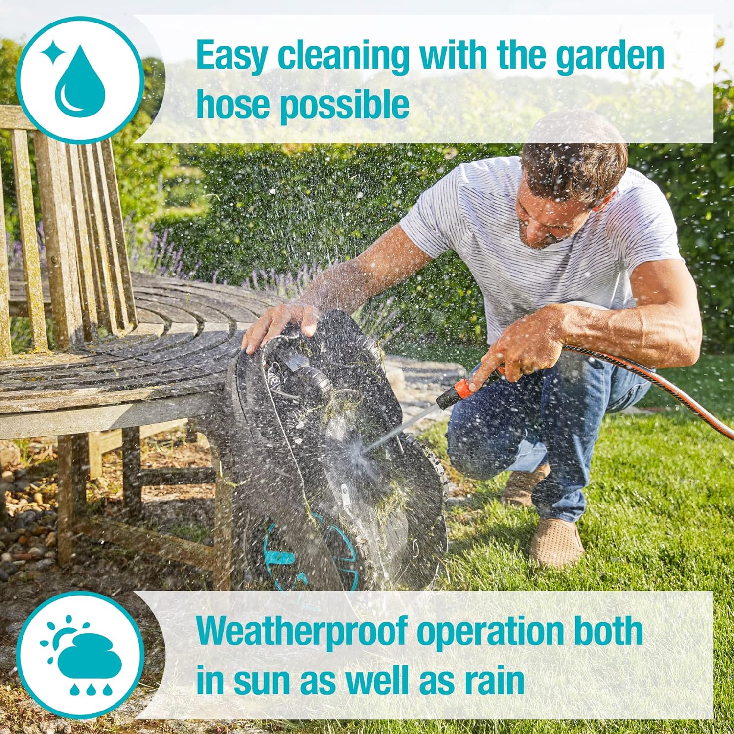 The Gardena SILENO City has been constructed so that simple spraying with the garden hose thoroughly frees housing, blades and wheels of dirt, dust and residual grass.