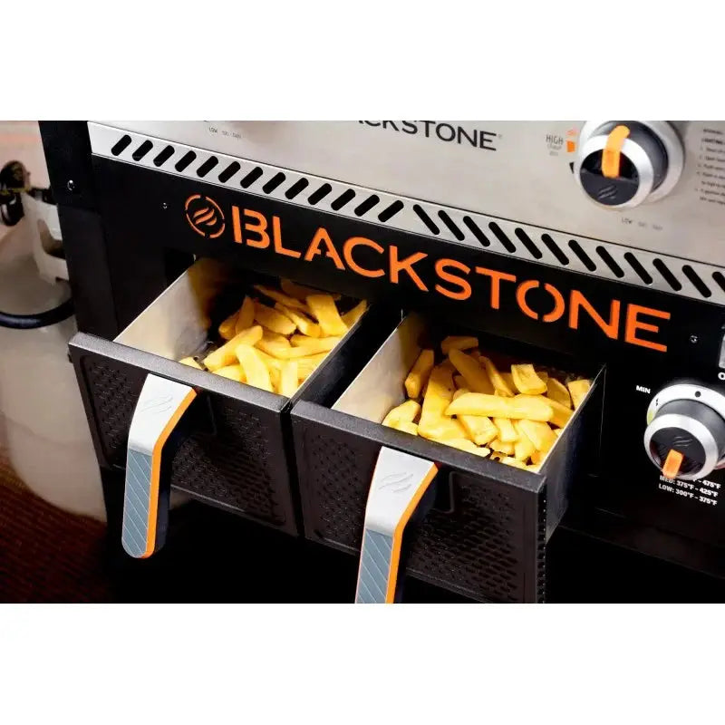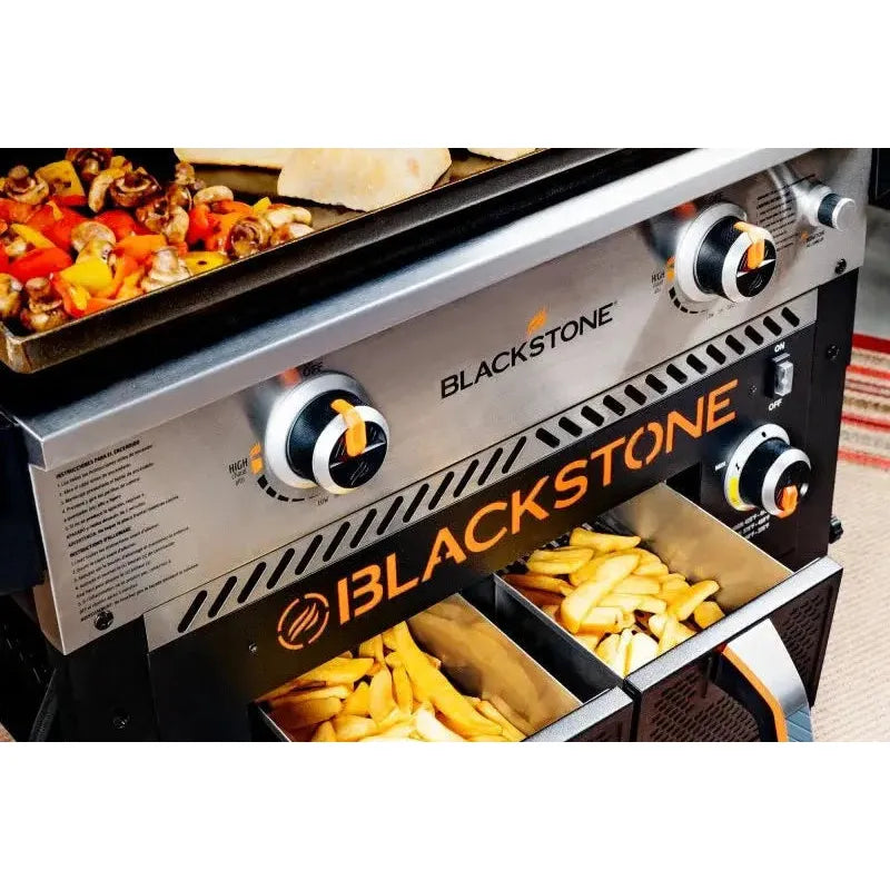With the Blackstone 2-Burner 28" Griddle with Electric Air Fryer and Hood, you can do it all: bake, sear, roast, sauté, and air fry.